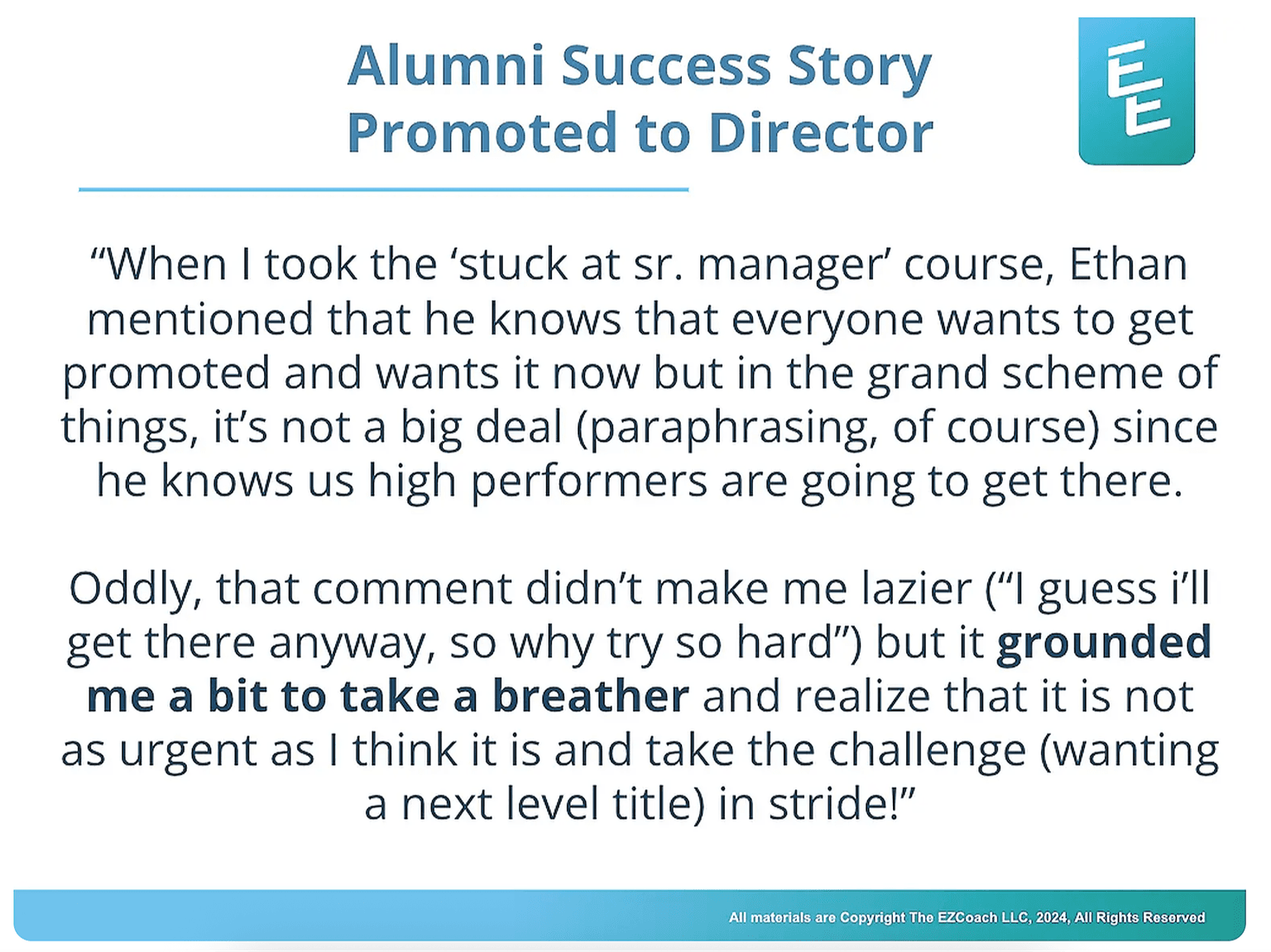 “I give so much credit to the Level Up: Breaking through to the Executive course and getting a front seat to Ethan's coaching and wisdom.” — Promoted to Director
