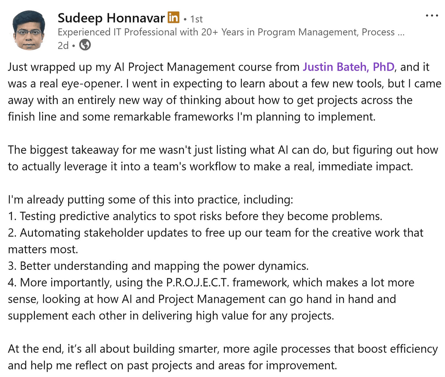 Dedicated labs where you’ll learn to build practical no-code AI workflows to streamline planning, automate status reports, eliminate manual work, and create repeatable systems that save hours every week. Also get a curated library of project-tested prompts for planning, reporting, and communication.