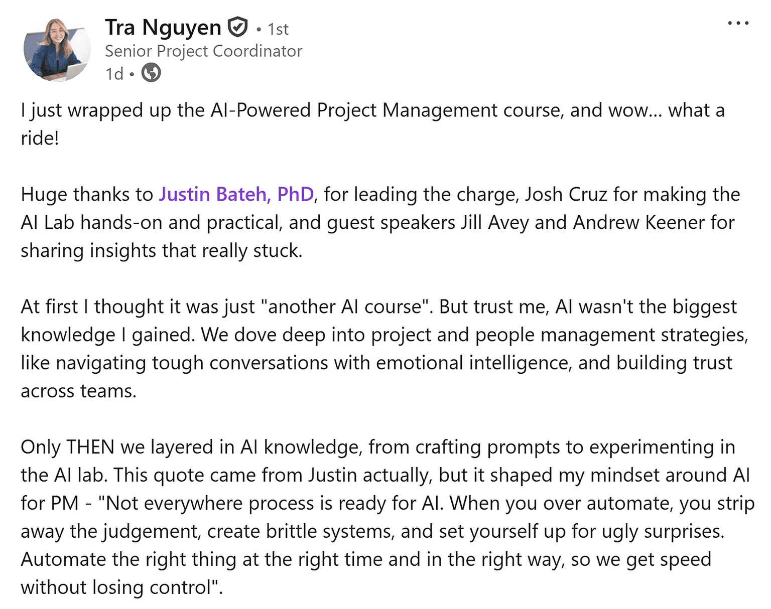 The optional Capstone Project lets you build a real AI Implementation Plan tailored to your work. Each week, complete one part and submit it for direct feedback, guidance, and consultation from Justin. By the end, you’ll have a practical, portfolio-ready blueprint you can use immediately on the job.