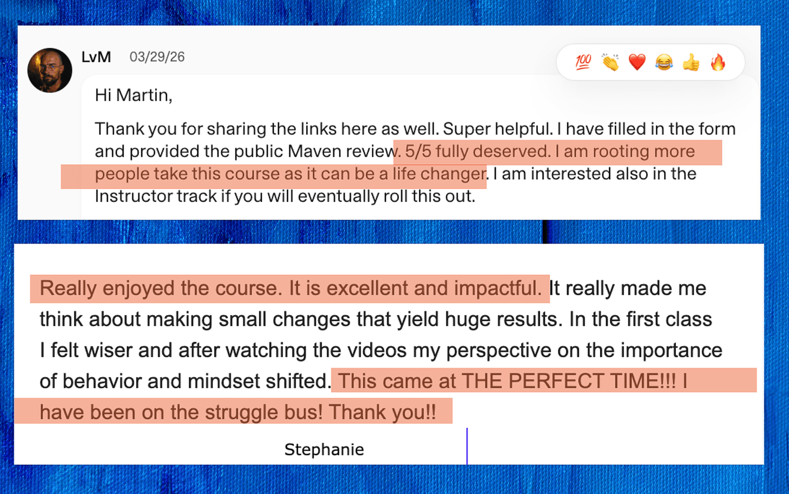 Deepen your learning with two optional live AMAs (Day 3 & Day 7, approximately 11am PST). Submit questions, learn from peers, and cement foundational insights from day one. These sessions help you troubleshoot challenges as you apply the framework in real-time. All AMAs are recorded for future review. *Days/times may vary per cohort.